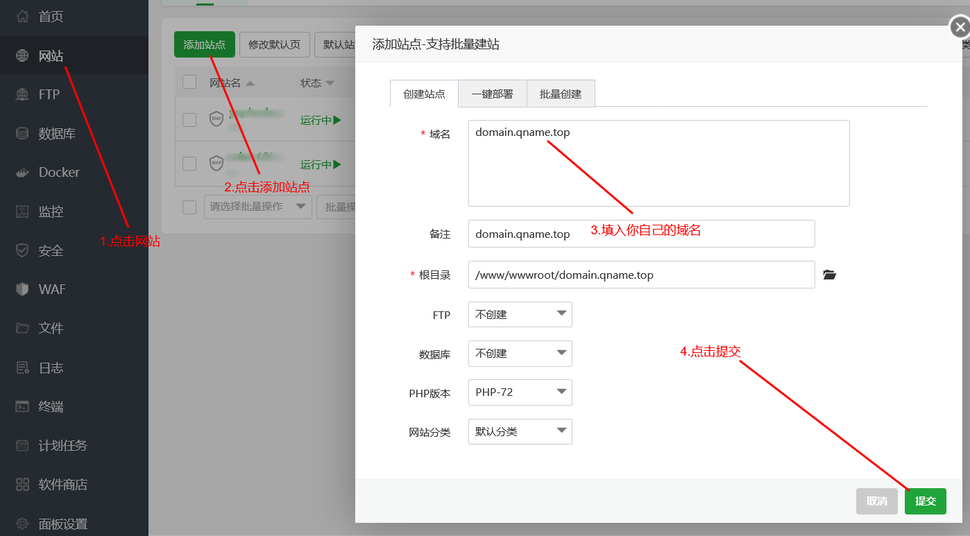 3、把你的域名解析到你的服务器,然后在宝塔面板新建站点,如下图所示: